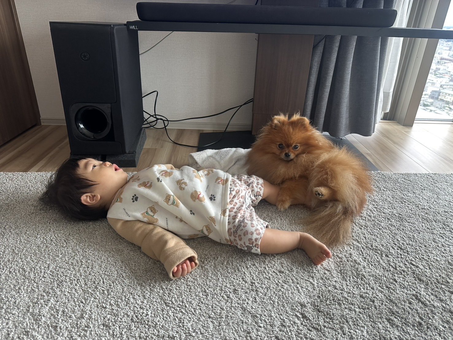 当時1歳の赤ちゃんに寄り添っているのは、シベリアンハスキーのもちくんとポメラニアンのきなこちゃんです。