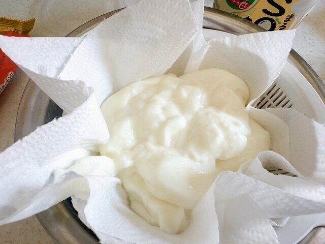 まずは水切りをします。ボウルとザルを用意し、ザルの上にキッチンペーパーを2枚のせ、その上にプレーンヨーグルトをのせるだけ。水切りヨーグルトもかんたんに作れます。