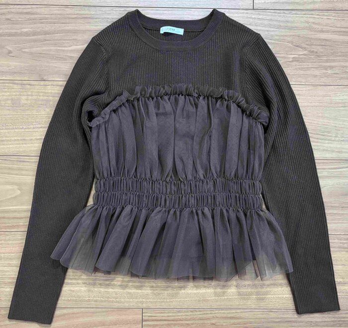 細身のリブニットにふわふわのシアーチュールが縫い付けられたトップスです。