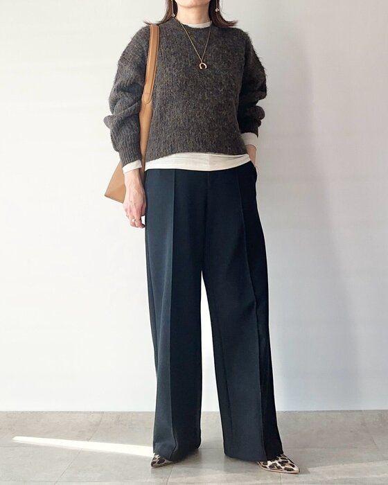 また、「ブラッシュドジャージーワイドパンツ」が着こなしに上品さをプラスしてくれるので、シンプルなニットを合わせてもカジュアルになりすぎず、洗練された大人の女性にぴったりのスタイリングが完成します。