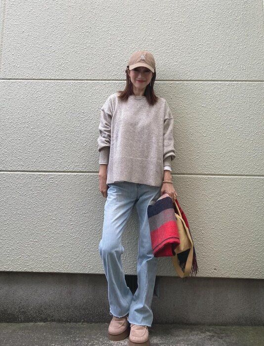 デニムをあわせた、シンプルなカジュアルスタイルもあか抜けた印象に仕上がるのは、「袖ボリュームミックスカラーオーバーサイズニット」のさりげなくおしゃれに見せる計算されたデザインだからこそ!