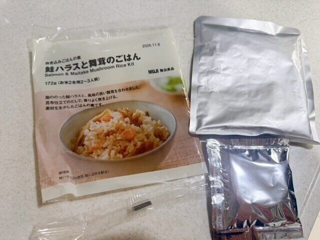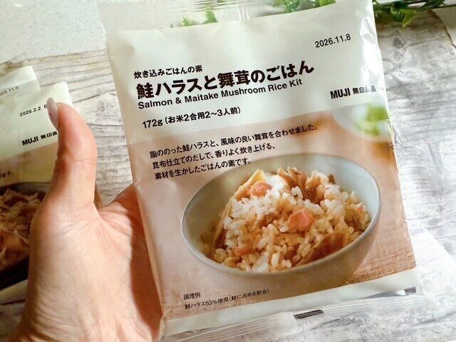 こちらです。【無印良品】「炊き込みごはんの素 鮭ハラスと舞茸のごはん」お米2合用2~3人前 490円(税込み)