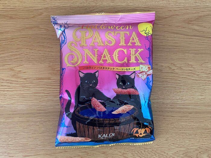 こちらは、ハロウィン限定で登場した「ハロウィンパスタスナック」。ハロウィンをイメージした、紫色と黄色のペンネタイプのマカロニをカリカリに揚げた、ベーコン味とチーズ味のパスタスナックです。