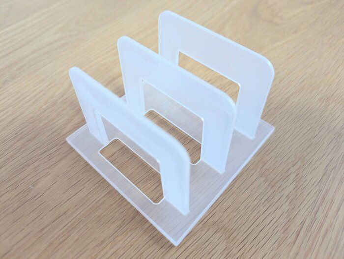 そこでおすすめなのが、ダイソーの「ドアポケットスタンド」(110円/JANコード:4956810959334)。倒れやすい食品を立て置きできる、ドアポケット用の収納スタンドです。仕切り幅は約26mmで、スライスハムやチーズをまとめて立たせるのにぴったり。奥行き85mm以上のドアポケットに対応しています。