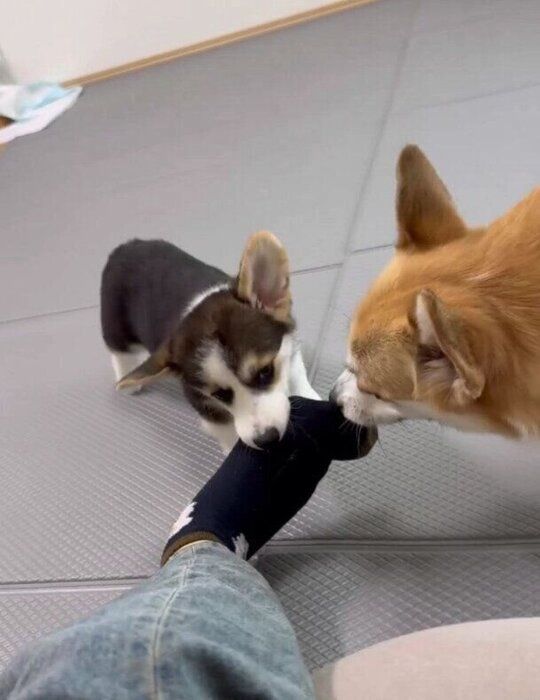 2頭が奪い合うように口にくわえるものは、どうやら飼い主さんの靴下みたい。