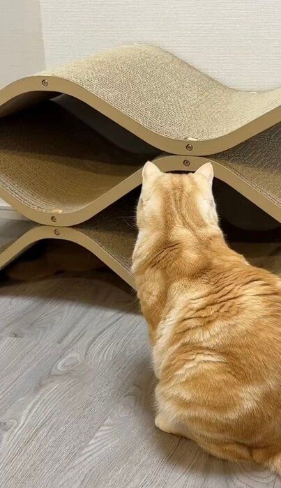 中が空洞になっている大きな爪研ぎの前に、兄ポッケくんが座っています。