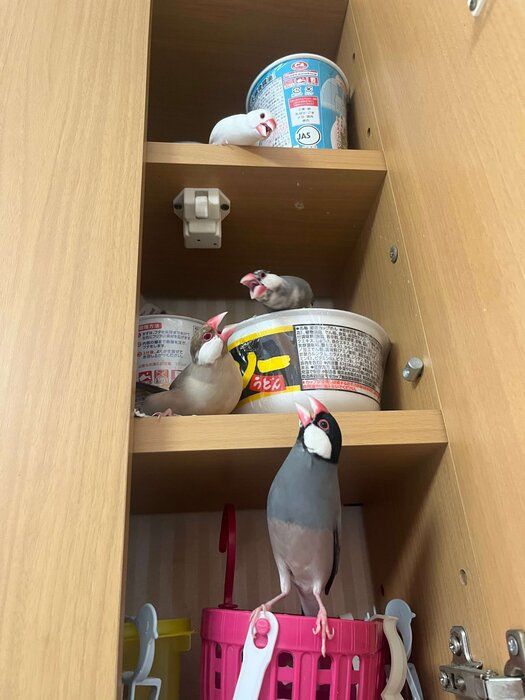 カップ麺が置かれた3段の棚をマンションにたとえたこちらの写真に写っているのは、かいぬしさんとともに暮らす4羽の文鳥ちゃんたちです。