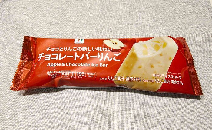 2026年1月7日よりセブンイレブンにて登場した「チョコレートバー りんご」。りんごの果肉がたくさん入ったアイスを、りんごクランチが入ったりんごチョコレートでコーティングしたアイスバーです。